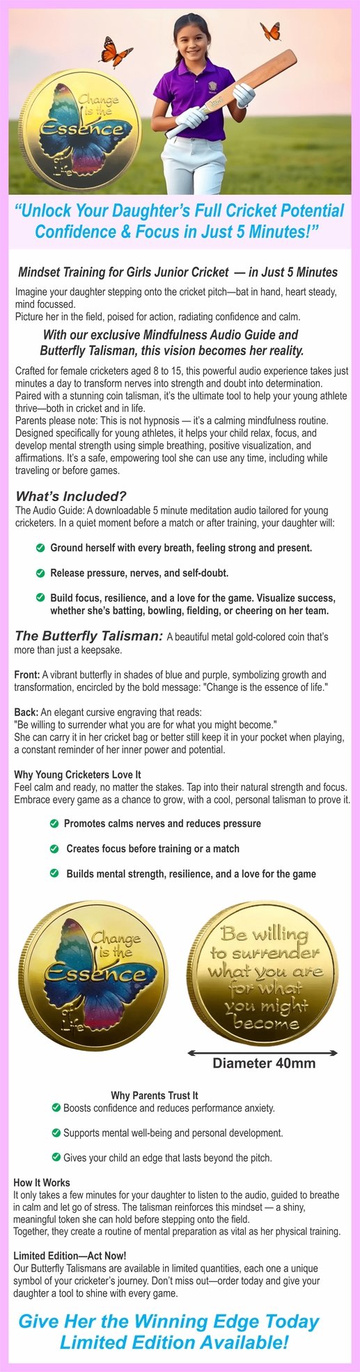 Unlock Your Daughter's Full Cricket Potential with Confidence & Focus The Butterfly Talisman and exclusive mindfulness audio guide are the perfect tools to help young female cricketers build mental resilience, focus, and calmness under pressure. Tailored for girls ages 8 to 15, this kit enhances not only physical skills but also mental strength, encouraging players to embrace each game with clarity and confidence.
