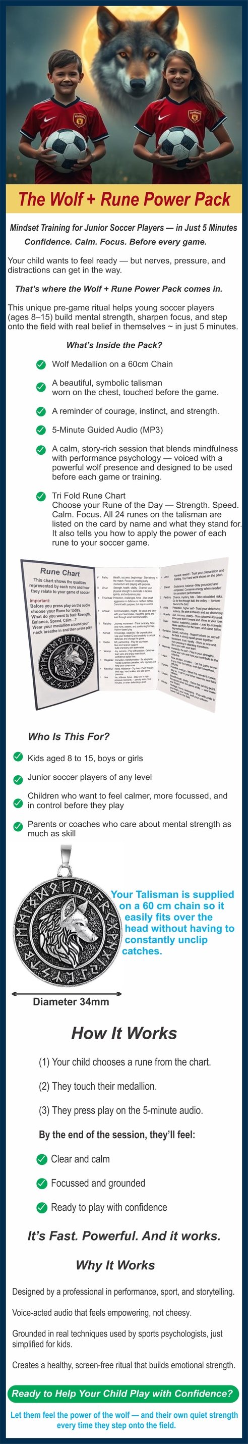 The Wolf + Rune Power Pack is designed to help young soccer players, ages 8 to 15, tap into their full potential by boosting their focus, resilience, and confidence. Combining a symbolic wolf medallion with a calming 5-