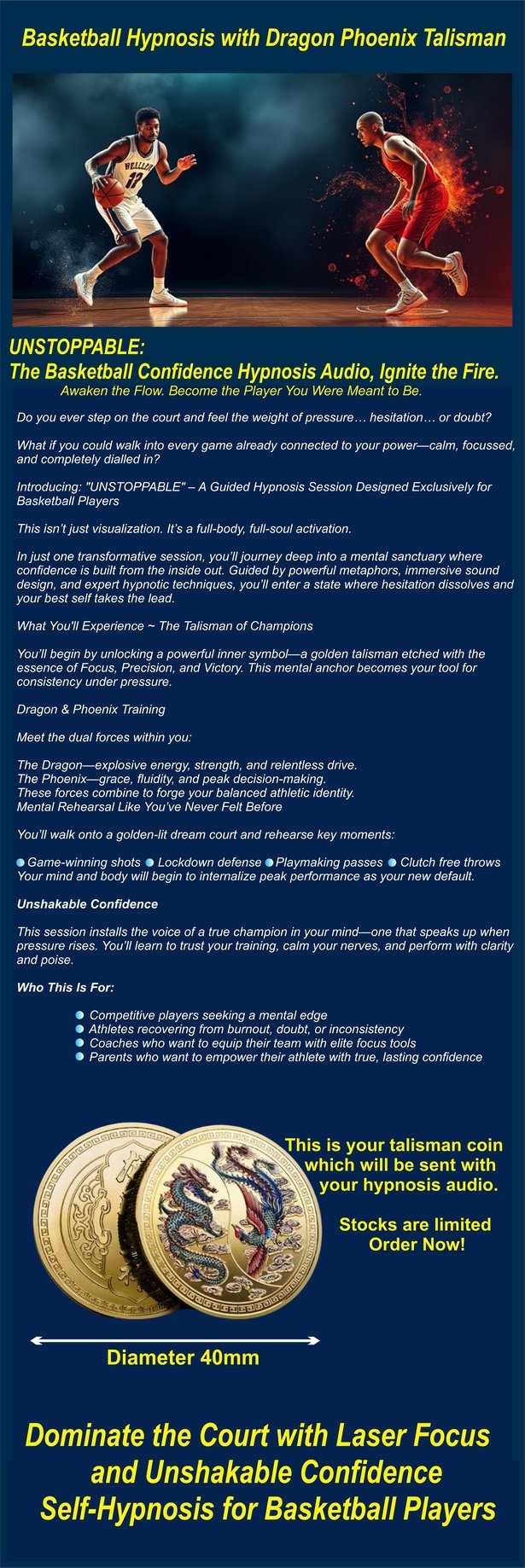 "Basketball Hypnosis with Dragon Phoenix Talisman," a powerful self-hypnosis tool designed to unlock your inner basketball champion. Featuring the "Unstoppable: The Basketball Confidence Hypnosis Audio," this guided session by a certified hypnotherapist ignites your flow and transforms you into the player you were meant to be. With a 40mm talisman coin featuring Dragon & Phoenix symbols, this audio enhances focus, precision, and unshakable confidence, helping you dominate the court. Ideal for competitive players, coaches seeking elite tools, and parents empowering athletes, the session includes cutting-edge techniques to boost mental resilience and performance. Limited stock—order now to receive your talisman coin with the hypnosis audio and elevate your game with laser focus and confidence!