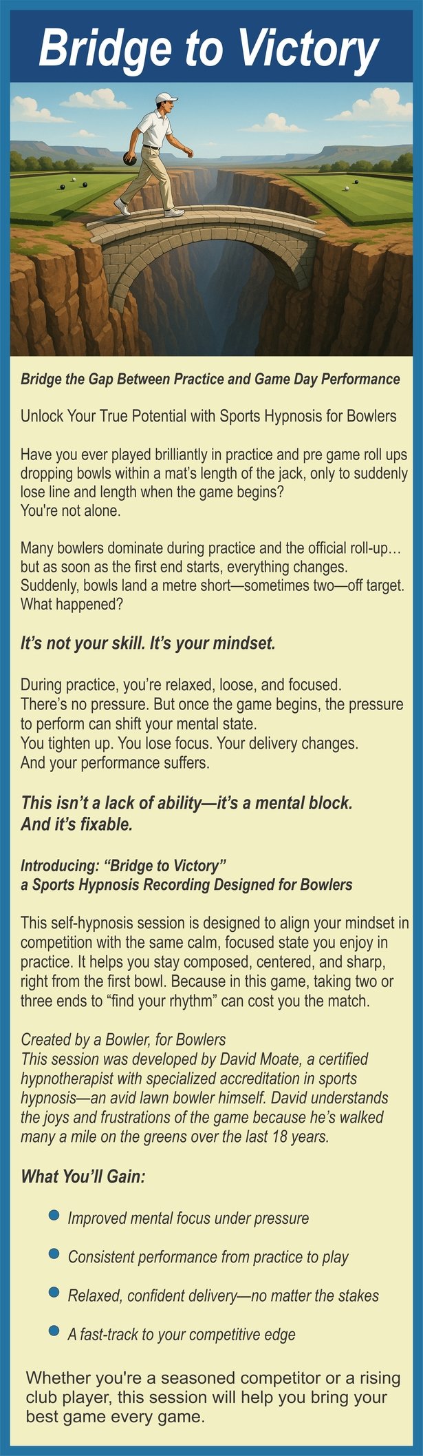 Elevate your lawn bowls game with "Bridge to Victory," a sports hypnosis recording designed for bowlers in Australia. This self-hypnosis session, crafted by certified hypnotherapist David Moate with specialized sports hypnosis expertise, bridges the gap between practice and game-day performance. Overcome mental blocks, enhance focus under pressure, and achieve consistent, relaxed delivery with this audio. Perfect for seasoned competitors or rising club players, it aligns your mindset for peak play, helping you dominate the greens. Download now to unlock your true potential and fast-track your competitive edge!