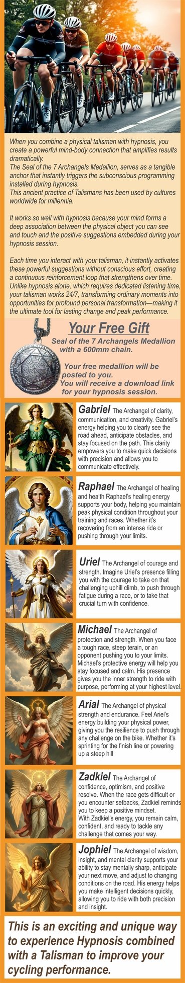 Boost your cycling performance with Cycling Hypnosis with FREE Archangels Medallion from Sports Mind Sync, leaders in mental training in Australia. Priced at $29.95, this unique self-hypnosis session, crafted by a certified hypnotherapist, enhances focus, endurance, and confidence using the Seal of the 7 Archangels (Gabriel, Raphael, Uriel, Michael, Ariel, Zadkiel, Jophiel). Paired with a free 60cm medallion, it creates a powerful mind-body connection. Download now to unlock mental clarity, overcome fatigue, and dominate races with laser focus and unshakable resilience—perfect for competitive cyclists!