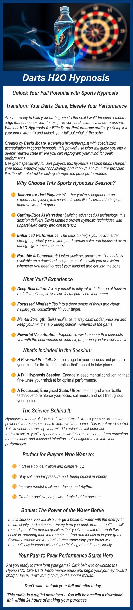"Darts H2O Hypnosis," a cutting-edge sports hypnosis session by David Moate, a certified hypnotherapist, designed to unlock your full potential in darts. Priced at an affordable rate, this unique audio experience transforms your darts game with enhanced focus, precision, and calmness under pressure. Utilizing advanced AI narration, the session delivers unparalleled clarity and consistency, strengthening your mental rhythm and performance during high-stakes moments. Perfect for dart players, it includes a pre-talk, full hypnosis session, and a focused, energized state using a charged water bottle as a performance anchor. Experience deep relaxation, a focused mindset, and mental resilience to hit your target consistently. Download Darts H2O Hypnosis today to boost concentration, stay calm under pressure, and elevate your game—receive your download link within 24 hours!