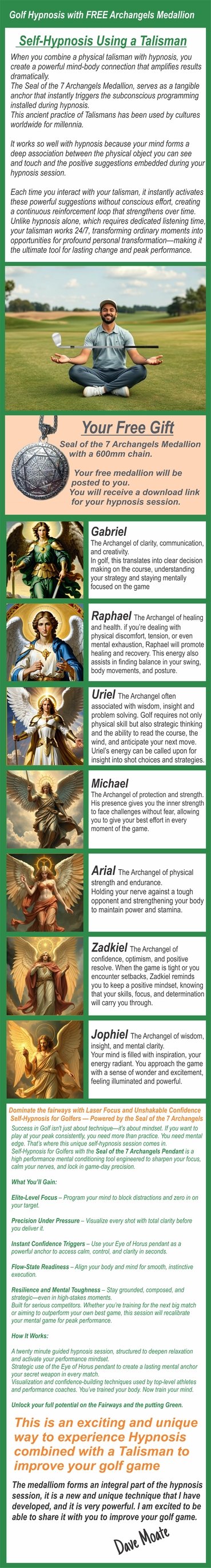 Elevate your golf game with Golf Hypnosis with FREE Archangels Medallion from Sports Mind Sync, leaders in sports mental training in Australia. This unique 20-minute self-hypnosis session, crafted by certified hypnotherapist David Moate, enhances focus, calms nerves, and boosts game-day precision using the Seal of the 7 Archangels (Gabriel, Raphael, Uriel, Michael, Ariel, Zadkiel, Jophiel). Paired with a free 60cm medallion, it creates a powerful mind-body connection. Download now to unlock elite-level focus, visualize shots with clarity, and dominate the fairways and putting green with laser focus and unshakable confidence!