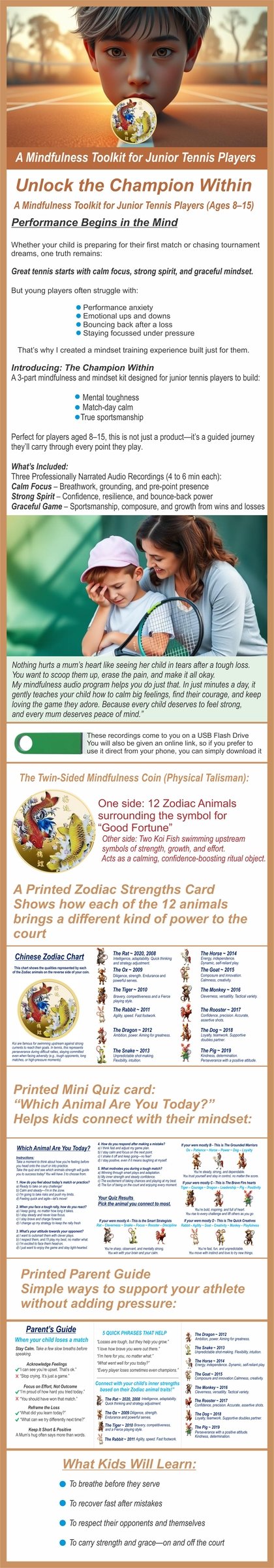 Discover the ultimate mindfulness toolkit designed for junior tennis players aged 8-15 with "Unlock the Champion Within." This 3-part mindset training experience helps young athletes build mental toughness, match-day calm, and true sportsmanship. Featuring professionally narrated audio recordings (4 to 6 minutes), a twin-sided mindfulness coin, a zodiac strengths card, a mini quiz card, and a parent guide, this guided journey enhances focus, resilience, and performance. Perfect for overcoming performance anxiety and staying composed under pressure, it’s a must-have for every young tennis star. Shop now to support your child’s growth on and off the court!