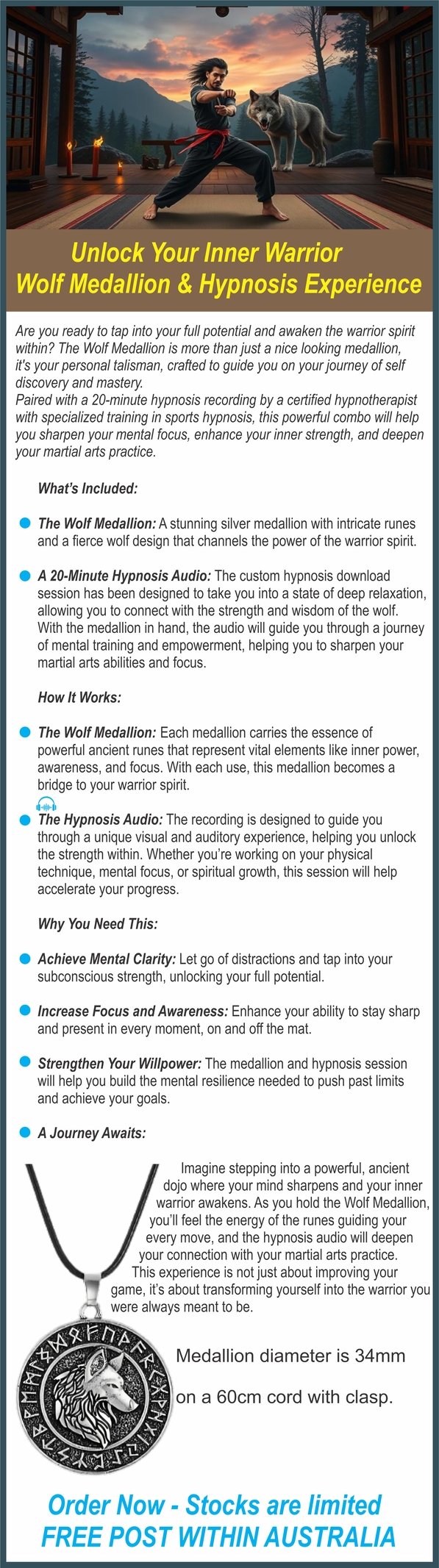 "Unlock Your Inner Warrior Wolf Medallion & Hypnosis Experience," a transformative tool designed to awaken your warrior spirit and enhance martial arts performance. Featuring a stunning silver Wolf Medallion with intricate runes, this personal talisman, paired with a 20-minute hypnosis recording by a certified hypnotherapist, guides you into deep relaxation and mental clarity. The custom hypnosis session sharpens your focus, boosts inner strength, and deepens your martial arts practice. The 34mm medallion on a 60cm cord, combined with the audio, unlocks subconscious power, increases focus, enhances willpower, and accelerates your progress. Ideal for achieving mental clarity and resilience, this limited-stock offer includes free post within Australia. Order now to start your journey to peak performance!