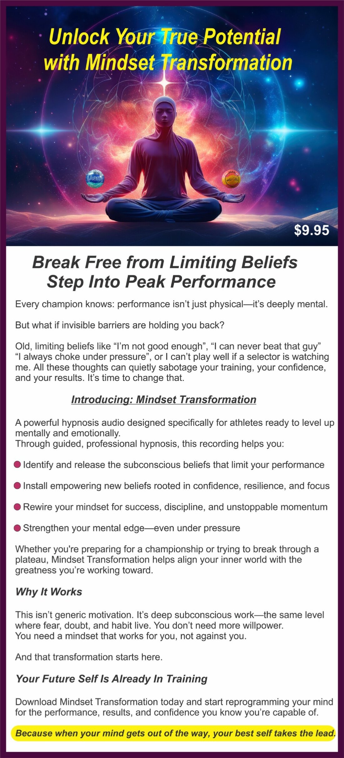 Unlock your true potential with Mindset Transformation, a powerful sports hypnosis audio designed for athletes in Australia. Priced at just $9.95, this session helps you break free from limiting beliefs like "I'm not good enough" or "I choke under pressure," boosting confidence and performance. Through guided hypnosis, identify and release subconscious barriers, install empowering beliefs, and strengthen your mental edge for championships or plateaus. Perfect for all sports, download now to rewire your mindset, align with your greatness, and let your best self lead on the field or green!