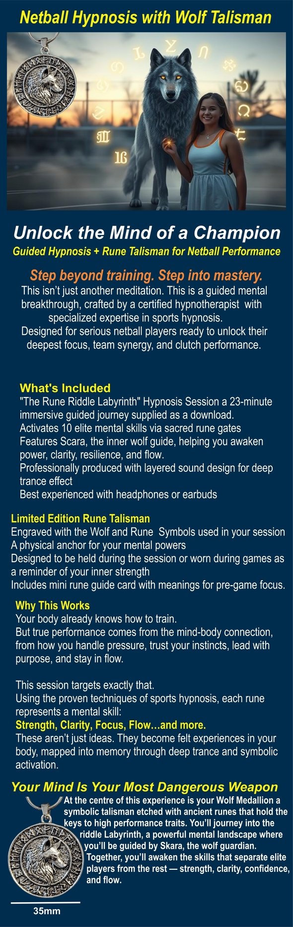 Elevate your netball game with our Netball Hypnosis with Wolf Talisman, designed to unlock the mind of a champion. This 23-minute "The Rune Labyrinth" hypnosis session, crafted by a certified sports hypnotist, boosts strength, clarity, focus, and flow for serious netball players in Australia. Paired with a limited-edition engraved rune talisman, this immersive guided journey enhances team synergy and clutch performance. Download now to experience layered sound design for deep trance, ideal with headphones. Perfect for pre-game focus, trust your instincts, and lead with purpose. Explore sports performance hypnosis and mental training to dominate the court!