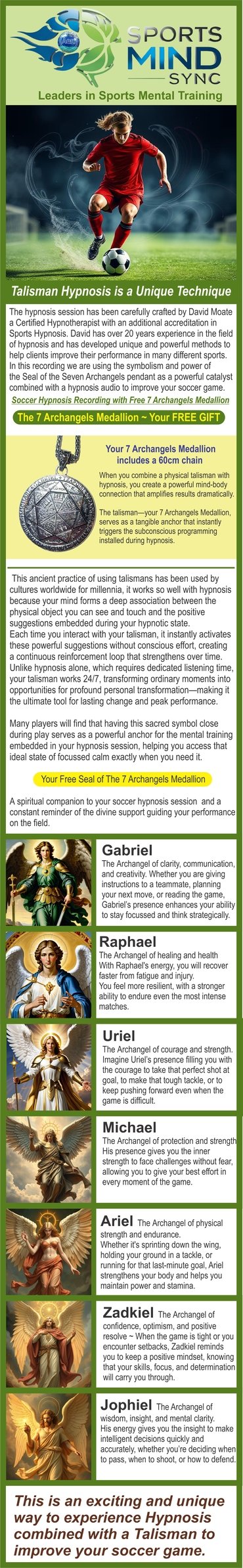 "Sports Mind Sync," a leader in sports mental training, offering "Talisman Hypnosis," a unique technique by certified hypnotherapist David Moate with over 20 years of experience. This soccer hypnosis recording, paired with the free 7 Archangels Medallion (60cm chain included), uses ancient symbolism to enhance your soccer performance. The medallion, featuring Archangels Gabriel, Raphael, Uriel, Michael, Ariel, Zadkiel, and Jophiel, serves as a powerful anchor, boosting clarity, healing, courage, strength, endurance, resilience, and wisdom. Designed to deepen focus and transform your game, this hypnosis session helps players achieve a focused, calm state instantly. Perfect for soccer players seeking a mental edge, order now to experience this innovative talisman-