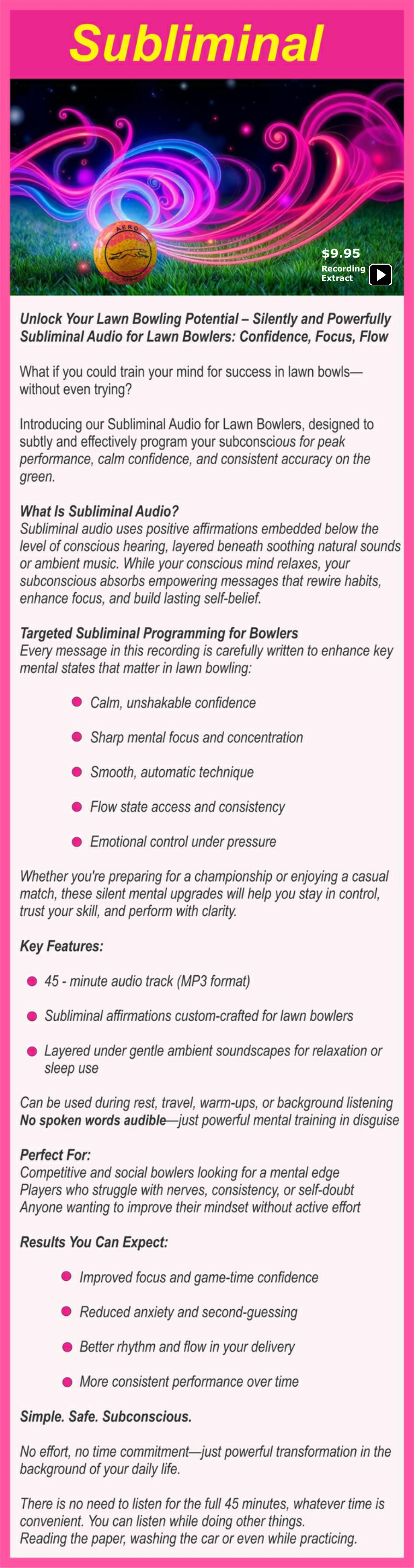 Unlock your lawn bowling potential with Subliminal Audio for Lawn Bowlers: Confidence, Focus, Flow. This 45-